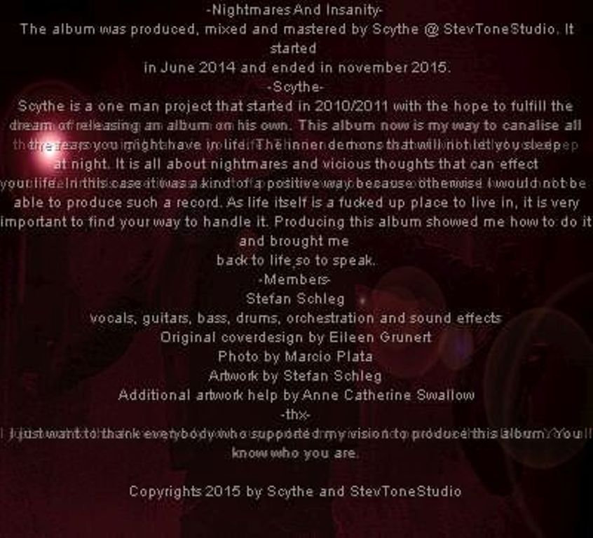Scythe is a one man project formed in 2010/2011. After beeing in several bands I have decided to do my own thing. What also